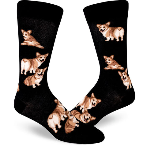 Strut your stuff in these irresistible Corgi Butt Strut Socks for men. Happy, Silly Corgis cavort on these black socks. Some are showing off their floofy backsides, some are splayed out with froggy legs and some are glancing over their shoulder at you, ready to go on an exciting corgi adventure.
