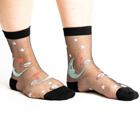Step into retro charm with our sheer moon socks. These celestial delights add a nostalgic twist to your style journey! These magical socks make any outfit 100% more magical. The base is sheer/ see-through, like black nylons, with a pattern of stars planets and crescent moon in shades of blue with pink and white. Style with heels, sneakers, flats, and more. Contents:78% polyester, 21% Nylon, 1% elastane, exclusive of elastic. Fits approximate women's shoe 5-10, men's approximate shoe size 3.5-8.5.