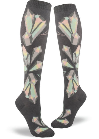 You're already dazzling on the inside so why not be dazzling on the outside!?!  These iron grey knee-high crystal socks show the colorful crystalline minerals from the toes all the way up. The alluring stones are thought to each have powerful associations: Everything from emotional and physical healing, promoting love and friendship, supporting intuition and mental order and clarity to providing protection in warding off negative energy. Whether these socks help you draw inspiration in setting intentions and encouraging magic moments or you just like the way they look, you can keep a little crystal magic with you whenever you have these socks on your feet! These knee highs are extra stretchy. They look great and feel comfortable on calves up to 18 inches.