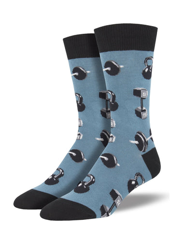 Well? Do you? Because these cool weightlifting socks are only for those who don’t skip arm day! They have an awesome pattern of dumbbells, barbells and kettlebells, making them the perfect accessory to rock while you pump that iron. Pick some up for yourself and your spotter!  Start your weight training by pulling up this pair of socks. This easy work-out can be done even on your rest day! Suitable for beginners, seasoned gym enthusiasts, and professional weight lifters. Steel Blue background, black accent at toe, heel and cuff.  Fits approximate men's shoe sizes 7–12.5. Content: 70% cotton, 27% nylon, 3% spandex.