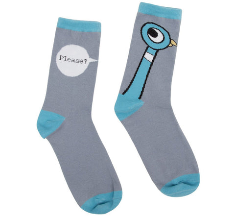 Do you trust this bird? He’s pretty persuasive, but how could he be a good driver? Contemplate that in these fun book themed socks featuring the children’s story Don’t Let the Pigeon Drive the Bus by Mo Willems! They show his silly illustrated face on one side with a speech bubble that says “Please?” on the other. Show your love of the Pigeon in style! And even better, every purchase donates one book to a community in need. Grey, blue, white black and a hint of yellow.. 75% cotton, 20% polyester, 5% spandex. Fits approximate women's shoe sizes 5.5–9,  Men's approximate shoe size 4-7.5