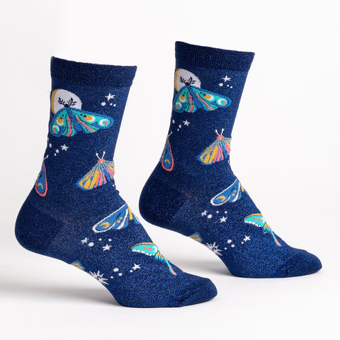 Sometimes we think of Moths as drab brown winged creatures that flap against the porch light. But the nighttime Moths on these shimmery socks exhibit an incredible array of colors and patterns that rival the most beautiful butterflies. Shimmery yarn adds depth and movement to these pretty socks.The fibers in these socks are certified by OEKO-TEX® Standard 100, which means no harmful chemicals, keeping your skin safe and happy. Content: 49% Cotton, 38% Polyester, 10% Metallic, 3% Spandex. Fits Approximate women's shoe sizes 5-10.