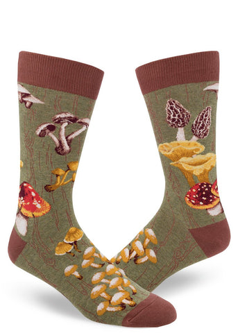 Finely detailed mushrooms pop up on these Moss Green crew socks. Morels, amanita muscaria, chanterelles, oyster mushrooms and more  come to life against a tree bark graphic background. Perfect for hikers, foragers, nature lovers and mushroom hunters, Content: 65% cotton, 24% nylon, 8% polyester, 3% spandex. Fits approximate men's shoe sizes 8–13.