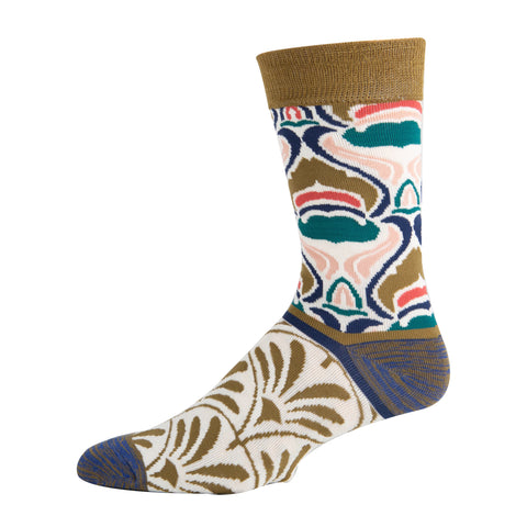 Fleur De Luz, Flower of light... whether it's a nod to the iconic Fleur-de-Lis, symbol of French royalty (and New Orleans) or Spanish influenced design or perhaps inspired by the intriguing French town of Saint-Jean-De-Luz, these sumptuous bamboo socks have a little bit of it all. Light and effervescent, stylized, floral motif conjuring a regal yet enigmatic presence. Rococo florals meet art-deco design on these handsome gold, ivory, teal, navy blue, salmon and coral socks. Added Bonus: Bamboo socks are soft, luxurious as well as breathable, anti-bacterial and anti-fungal so your feet stay comfortable and healthy. Fits men's shoe size 6 to 12, fits women's approximate shoe size 8.5-13.5. 70% Rayon from Bamboo, 27% Nylon, 3% Spandex.