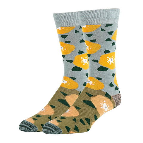 A fresh pop of sunshine blooms forth on these cheery floral themed socks. Citrus yellow and melon colored blossoms cover these green and blue bamboo socks. Added Bonus: Bamboo socks are soft, luxurious as well as breathable, anti-bacterial and anti-fungal so your feet stay comfortable and healthy. Fits men's shoe size 6 to 13, fits women's approximate shoe size 8.5-13.5. 65% Rayon from Bamboo, 32% Nylon, 3% Spandex.
