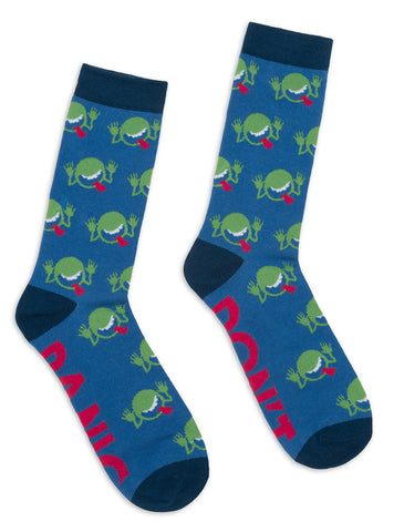 Forget a towel, these socks are the new necessity for journeying through space! "Don't Panic" is printed in bright fuchsia on the bottom of these colorful literary socks. Content: 75% cotton, 20% polyester, 5% spandex. Fits approximate men's shoe sizes 7–13.