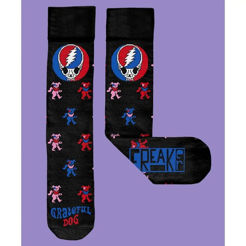 Pay homage to the iconic Dancing Bears from the Grateful Dead with our Grateful Dogs. Wear your appreciation for the iconic American band with these black, pink, red, white and blue socks featuring the Steal Your Face Skull , canine style and dancing dogs. These socks are Knit with super soft combed cotton picked in Georgia, then spun, dyed, and knit into socks in North Carolina. Help make a difference with a small ENVIRONMENTAL foot print! One Size Fits Most, knit with reduced cross stretch for a better fit!