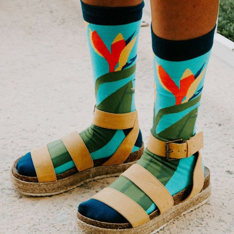 This stunning flower gets its name from its unique shape which resembles a tropical bird in flight. A fun fact about this flower is that the giant bird of paradise can grow up to 30 feet high. You'll certainly stand tall and strike a magnificent silhouette in these gorgeous Bird Of Paradise socks! Each pair of socks is made with high quality woven cotton that feels soft and luxurious and features extra padding in the toes and heels to make your feet extra happy.