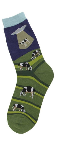 Wear these Bovine Abduction socks and see where they lead you. A UFO  Hovers above a placid herd of cows, one in its tractor beam. Maybe they just need some milk to go with their cookies? The truth is out there. Fits women's shoe size 4-10. Content: 65% cotton, 15% nylon, 15% polyester, 5% spandex.
