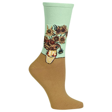 This very detailed sock from the Hot Sox Artist Series, features Van Gogh's classic Sunflowers painting on a lovely mint colored background. Fits women's shoe size 4-10.5. Content: 58% cotton, 35% nylon, 2% spandex, 1% rubber, 4% other fiber.