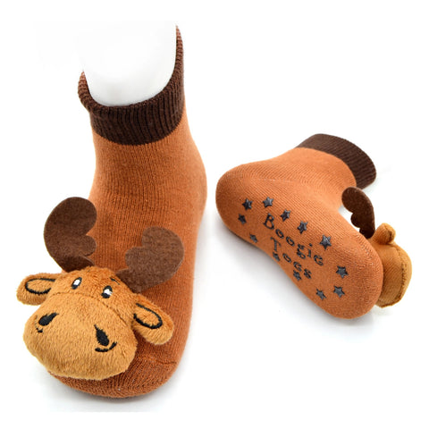 The sweetest wilderness vibes are yours with these Moose friends on your kiddo's feet! Mocha brown, camel and black look great with everything and speak to a love for outdoor adventure and the animal kingdom. Adorable antlers are a trademark moose characteristic and a stand-out feature on these socks! Eco-friendly, rubber grip-bottoms provide traction for new walkers. And friendly stuffed moose faces double as rattles. Soft-stretch opening is gentle on baby/toddler's legs and feet.