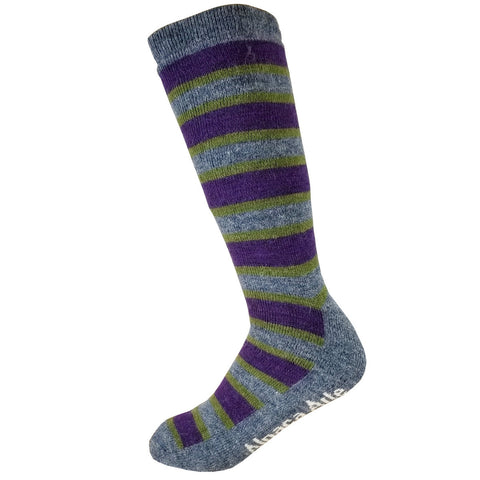 These Fair Trade Alpaca Socks are a Sock Shack staff and customer favorite. They're crafted in Peru and are the best things to have on your feet when it gets cold. Much softer and less allergenic than wool, but twice as warm and not too thick so you don’t need to struggle to get your shoes on over them. They wick moisture from your skin to keep your feet comfortable and dry. Denim blue background, deep purple nad olive green stripes. These alpaca socks are made with 43% Alpaca, 43% Acrylic and 14% elastic for warmth, strength and durability.