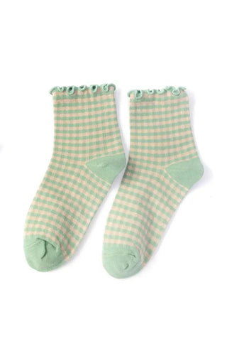 Keep it cute and classy and just a little sassy with this frilly lettuce edged plaid/ gingham ankle sock! Featuring an eye-catching gingham design and a frilly edge that’ll look good on your feet, no matter the footwear.